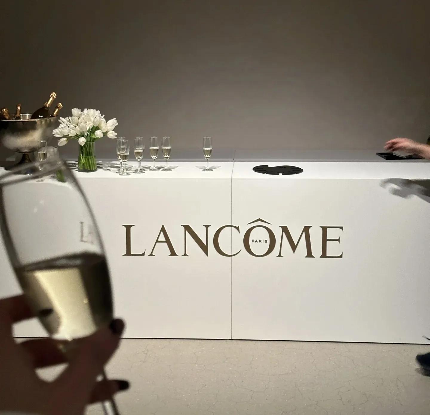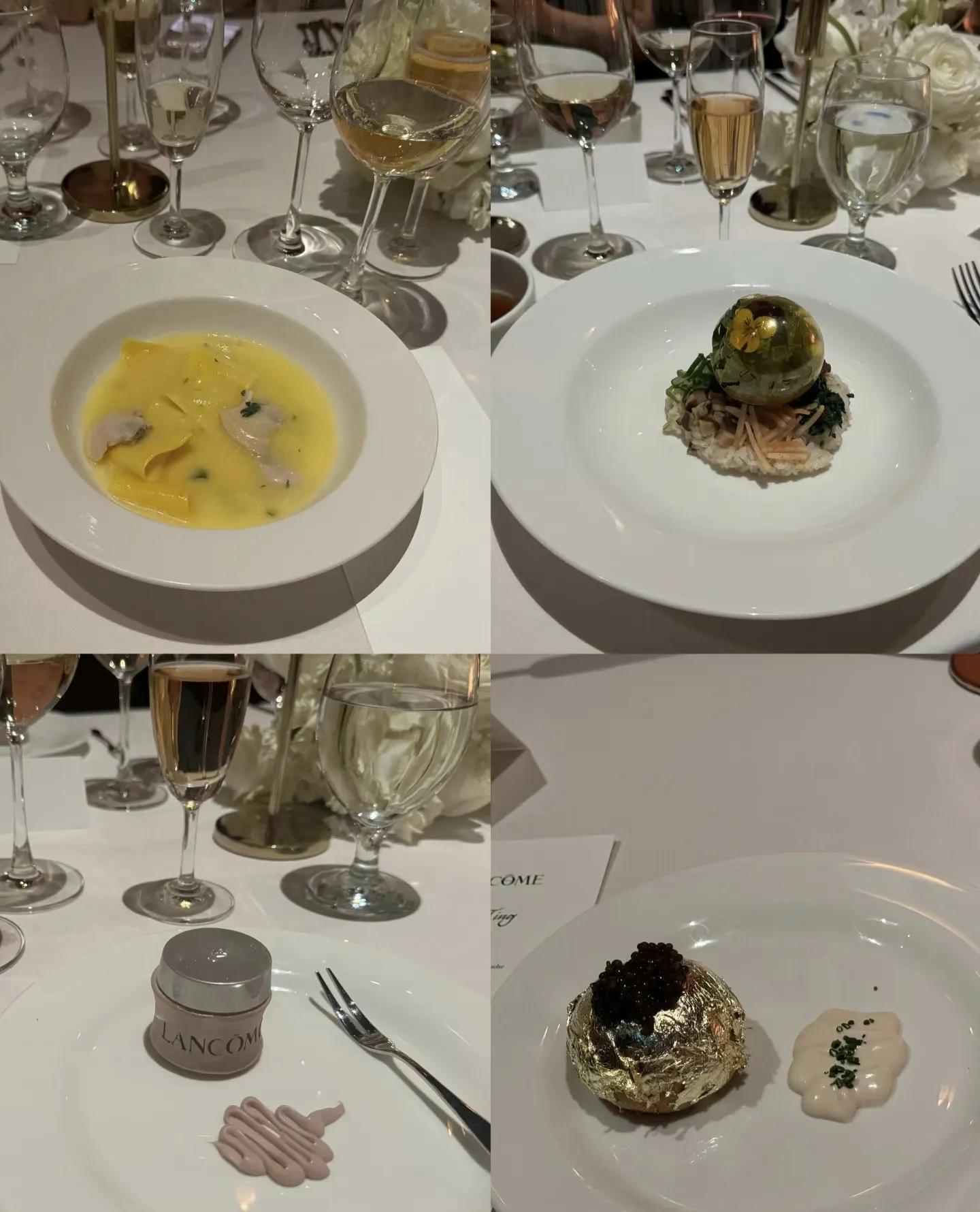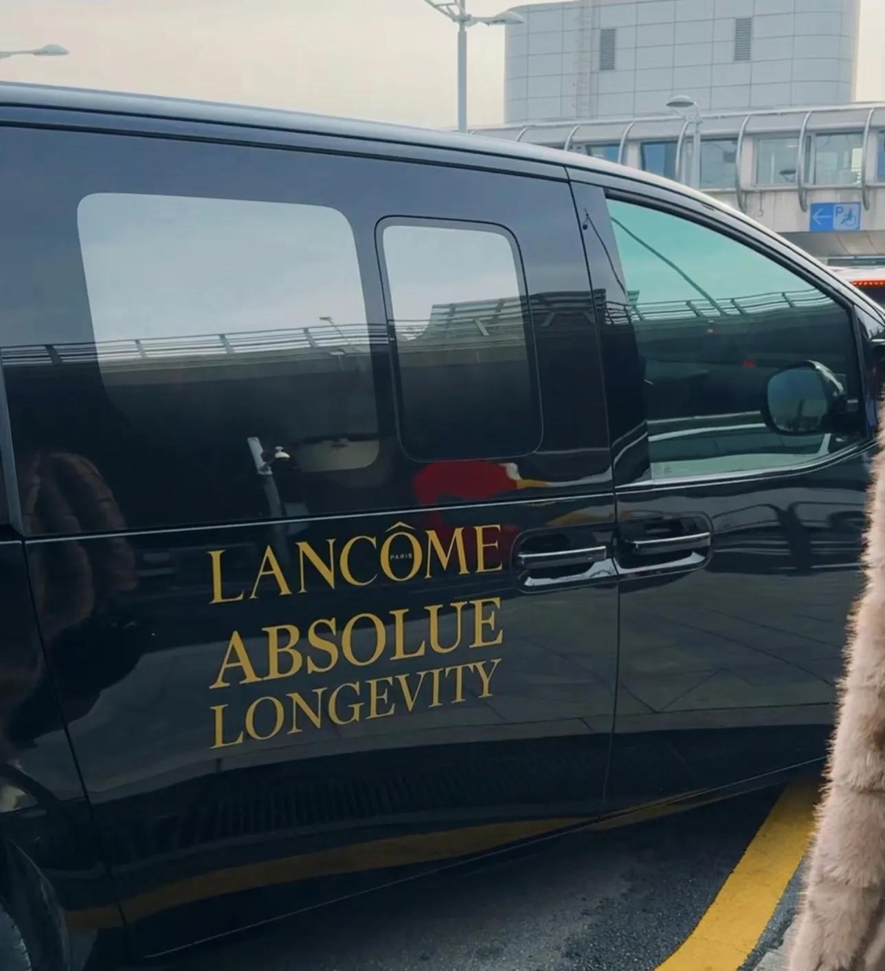 这是兰蔻新版菁纯系列的亚洲发布秀,现场布置高端又隆重,名贵香槟、精致餐点,每张餐台上还放着鲜花跟蜡烛,烘托浪漫气氛,名流们就在这种环境中社交洽谈、欣赏兰蔻新品,真是富贵又闲适,品牌方对嘉宾们的待遇也很好,安排了专门的酒店,还有专车接送,车身印有“LANCOME”标志,排面拉满。