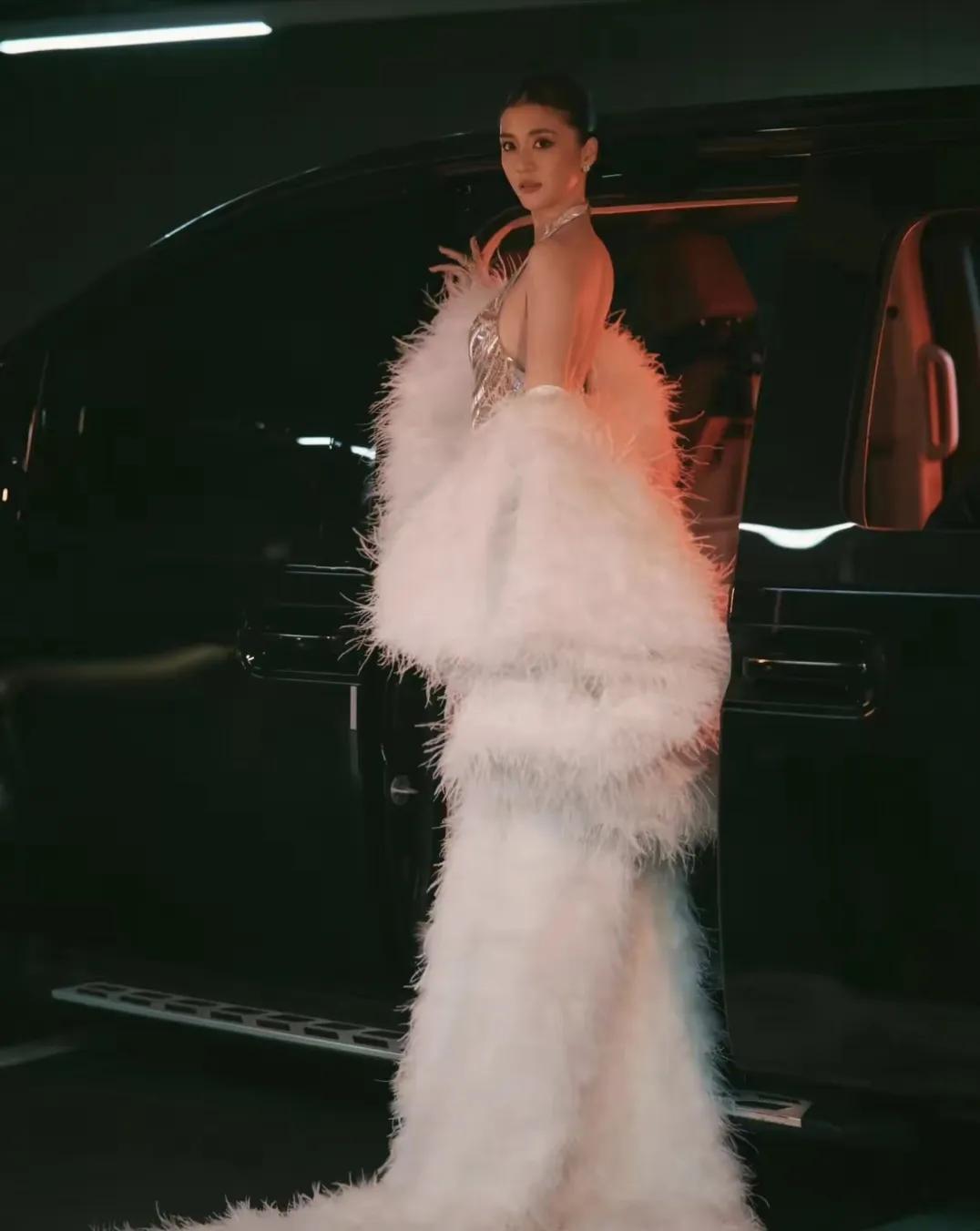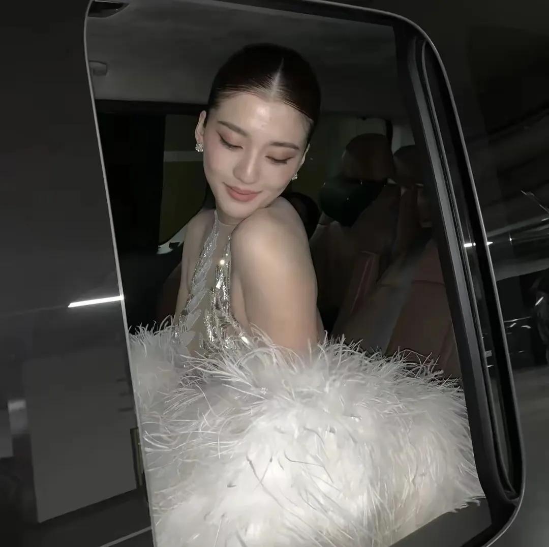 何超莲一旁坐着的是吴千语,她在当晚出尽风头!造型是一身银色羽翼礼服,设计很特别,深V+开叉+露大背,非常性感,她搭配了绒毛大披肩,更添贵气,她在车上时就忍不住摆起了pose,到达现场后,更是张扬明媚,嫁进豪门后,她更自信也更有贵妇范了。
